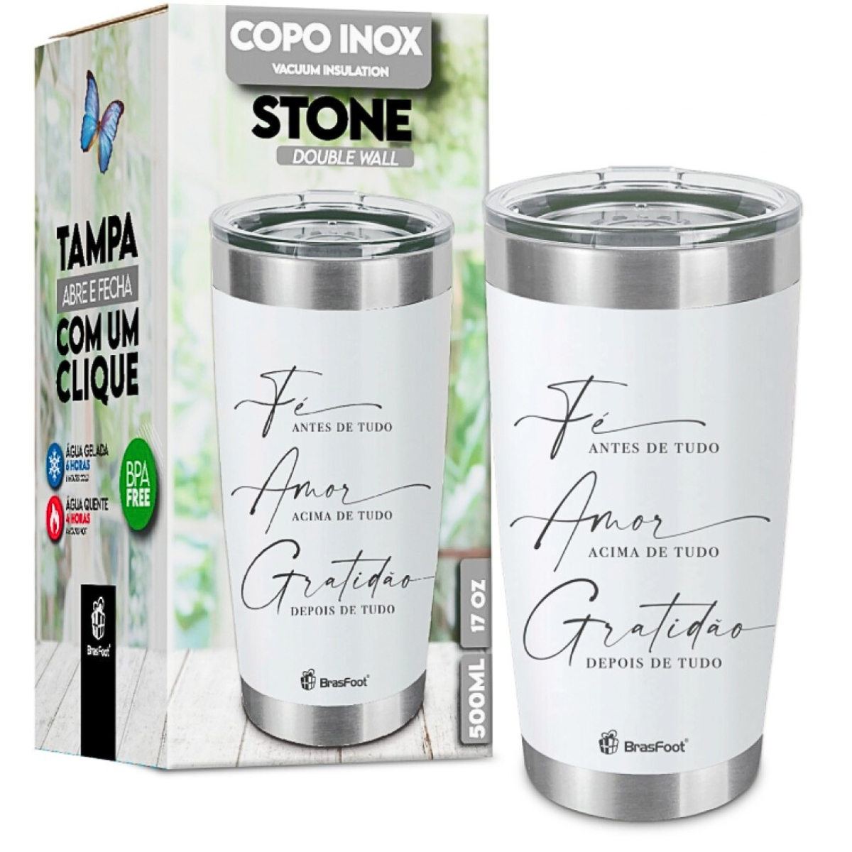 Ele tem uma parede dupla com isolamento a vácuo que mantém sua bebida gelada por até 6 horas e quente por até 4 horas. Além disso, ele tem uma tampa abre e fecha com um clique e uma válvula de pressão que evita o suor externo e a ferrugem. O copo é feito de inox na cor branca e tem um lindo lettering de fé e gratidão que vai inspirar o seu dia. Com capacidade para 500 ml, ele é ideal para um chopp, uma cerveja, um café ou um chá. Leve o seu COPO STONE TÉRMICO INOX - FÉ E GRATIDÃO 500ML da marca Brasfoot para onde quiser e aproveite cada gole da sua bebida.