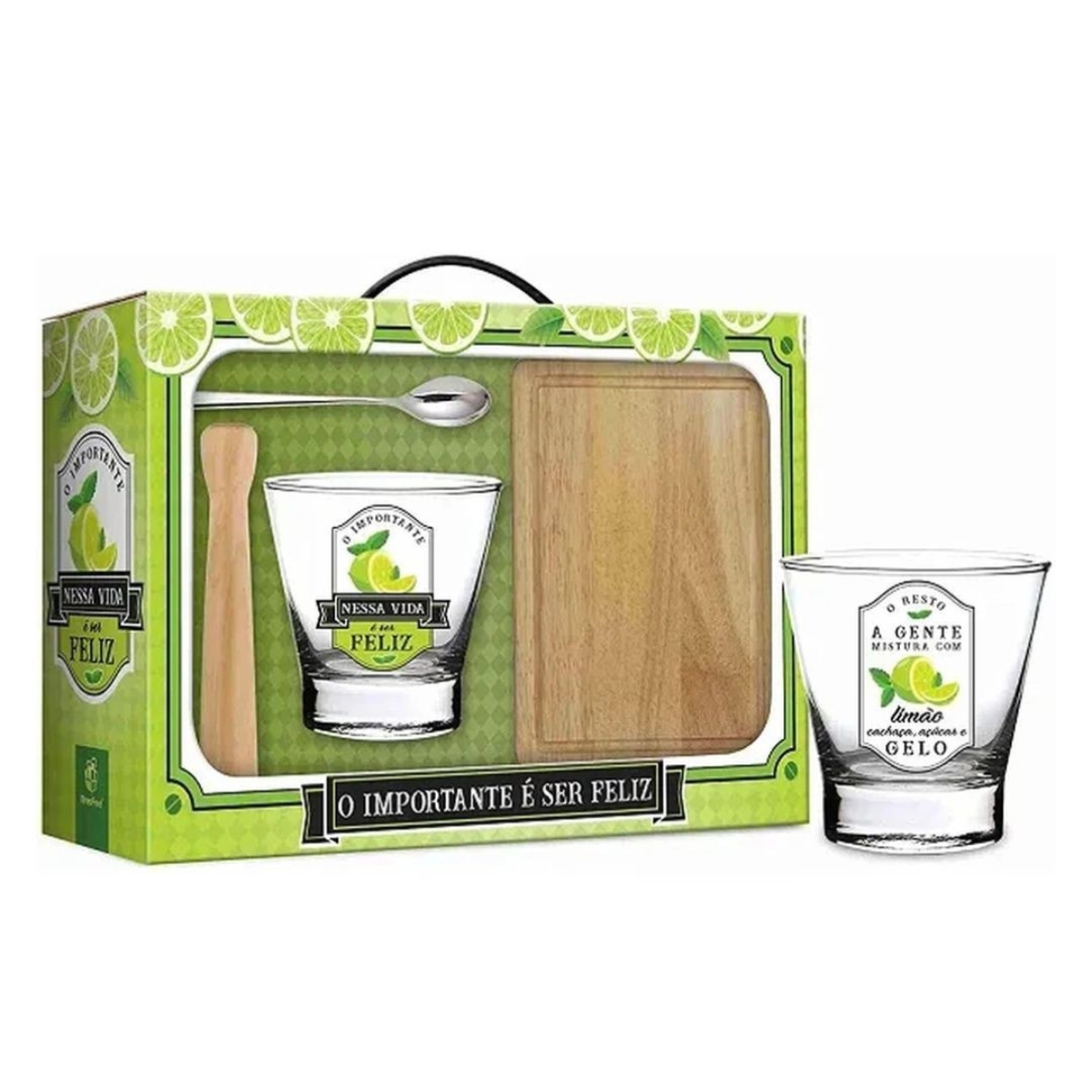 Conjunto caipirinha " O importante é ser feliz - brasfoot " com copo socador, colher e tábua é o kit perfeito para você preparar sua deliciosa caipirinha!